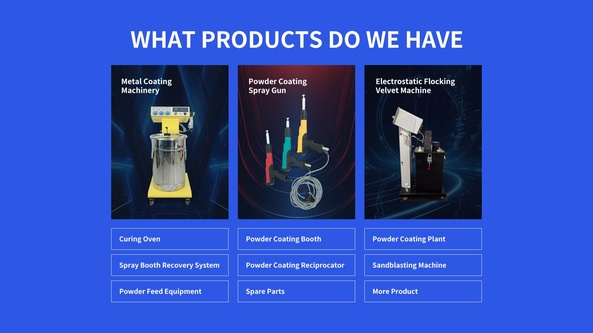 Powder spraying guns are used in automotive refinishing, metal furniture coating, appliance manufacturing, and industrial machinery.